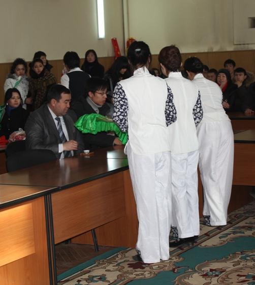 Ректор КНУ, профессор А.А.Акунов поздравил всех присутствующих с Новым годом, приветствовал участников концерта из СПУ, рассказал о том, что в СПУ учатся наши студенты, им созданы хорошие условия для учебы и проживания. В частности, им выплачивается стипендия в размере 200 долларов США. Далее, он дал краткую информацию о сотрудничестве с Институтом Конфуция и пригласил тех, кто хочет изучать китайский язык, поступить в вышеназванный институт и поехать в Китай