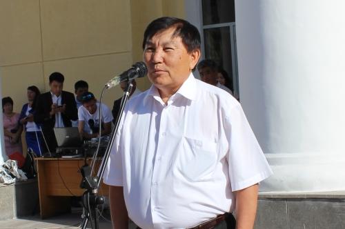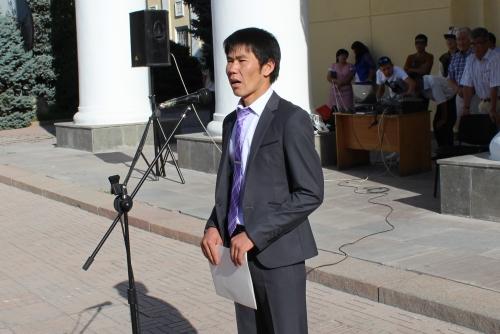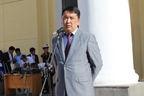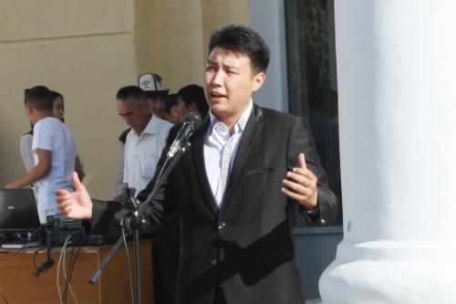 Кыргыз Республикасынын гимни ойнолуп бүткөн соӊ, КУУнун ректорунун милдетин аткаруучу, философия илимдеринин доктору Эрмек Усекеев Улуттук университеттин студенттерин жаӊы окуу жылынын башталышы менен куттуктап, аларга чың ден соолук жана окуудагы ийгиликтерди каалады.
