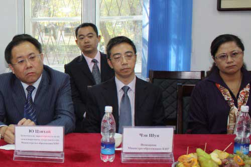10 октября 2012 года КНУ посетила делегация министерства образования КНР во главе с помощником министра господином Чэнь Шунь. В состав делегации также входят: Ю Цзихай - заместитель директора отдела по международному сотрудничеству МО образования КНР (ОМС), Ван Хуэй - координатор проекта ОМС, Чжансяо Дун - начальник департамента европейских и азиатских стран ОМС, а также Чжоу Цзоую - проректор Синьцзяньского педагогического университета, Сунь Юхуа - директор Далянского института иностранных языков и Цзясун Цзие - профессор Хэйлунцзянского университета. В конференц-зале учебного корпуса №4 членов делегации принял ректор КНУ, профессор Искендер Исамидинов. На встрече обсуждались вопросы текущей деятельности и перспективы развития Института Конфуция при КНУ.Ректор КНУ отметил, что Институт Конфуция при КНУ (ИК) осуществляет свою деятельность начиная с мая 2009 года при поддержке правительств Китая и Кыргызстана. Большую помощь оказывает также посольство КНР в КР. Стараниями своих сотрудников, а также волонтеров ИК достиг хороших результатов. Институт вносит огромный вклад в развитие сотрудничества между КНР и КР.
