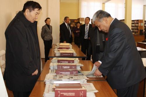 "Ремонт жакшы болуптур. Бул үчүн Мелис Ибрагимовичке кол чапкылачы. Таалай Тултемирович да көп аракет кылды. Былтыр 147 миң сомго жазылышыптыр. Эми, университетке 147 миң деген... Андан көрө, жазылбай эле койгон жакшы да. Азыр Кыргызстандагы мезгилдүү басма сөз, журналдарга, о.э. Москвадан чыга турган математика, физика, география, психология, педагогика ж.б. боюнча – иши кылып каталогдогу журналдардын баарына 1-2 ден жазылдык. Бул жерде жок дегенде 1 экземпляр турсун. Ошондо 500 миңдин тегерегине барып түштүк. Бул 6 айга эле. Бир жылга 1 млн. сом болот. Дагы жазылабыз. Мындан сырткары, 1.5 млн. сомго жаңы китептерди алдык. Эмки жылы дагы көбөйтөбүз.