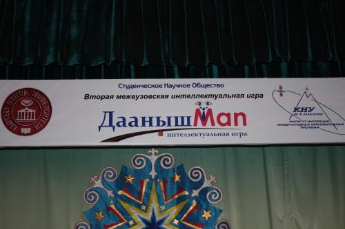 Сегодня, 29 ноября 2012 года, в большом актовом зале КНУ студенческое научное общество Института интеграции международных образовательных программ в рамках празднования 80-летия Национального университета провело II межвузовскую интеллектуальную игру «ДаанышMan». Цель игры - повышение конкурентоспособности знаний студентов, применение теоретических знаний на практике и поиск новых путей решения выхода из кризисов и конфликтных ситуаций. В игре приняли участие студенты 1, 2, 3-х курсов КНУ, КТУ "Манас", МУК, АУЦА, АГУПКР, БГУ, КРСУ, МУ "Ата-Тюрк Ала-Тоо" и КГЮА, обучающиеся по специальностям «Международные отношения», «Мировая экономика», «Международное право» и «Государственное управление». Участников игры приветствовал директор ИИМОП, профессор Николай Бредихин.
