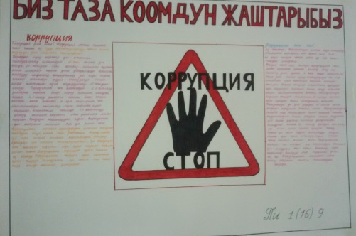 Билим берүү жана илим министрлигинин №01-4/225 билдирүү катына ылайык жана өлкөбүздүн коррупцияга каршы мамлекеттик стратегиясын ишке ашыруу максатында, о.э. «Бүткүл дүйнөлүк коррупцияга каршы күрөш күнүнө» карата 2016-жылдын 9-декабрь күнү педагогика факультетинде тайпалар арасында “Биз коррупцияга каршыбыз!” аттуу дубал гезиттер сынагы жана тегерек үстөл өткөрүлдү.