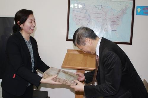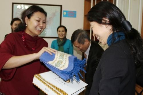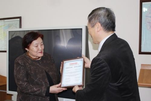Господин Эгучи Хироши поблагодарил ФМОиВ за сотрудничество с Международным фондом Тошиба и вручил декану факультета Р.Бейбутовой диплом за вклад факультета в изучение японского языка в КР.