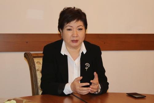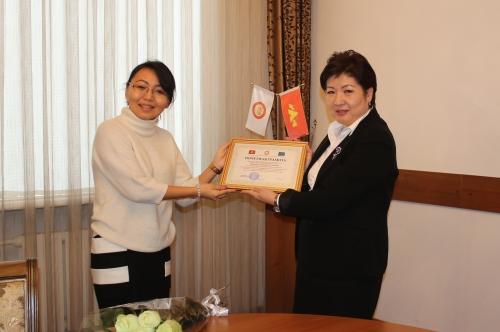 В завершение встречи ректор КНУ вручила национальному координатору Эразмус+ в Кыргызстане Гульнаре Чокушевой Почетную грамоту Национального университета.