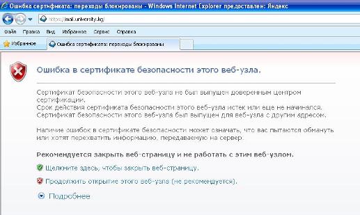 Для этого выполните указанные ниже действия.1. В обозревателе Internet Explorer 7 выберите команду Свойства обозревателя в меню Сервис. 2. Перейдите на вкладку Безопасность. 3. Выберите значок Надежные узлы и нажмите кнопку Узлы. 4. Введите URL-адрес ( https://mail.university.kg ) в поле Добавить в зону следующий узел и нажмите кнопку Добавить. 5. Нажмите кнопку Закрыть. 6. Нажмите кнопку ОК Способ 2. Установка самозаверяющего сертификата Microsoft Windows.Для этого выполните указанные ниже действия.1. В обозревателе Windows Internet Explorer 7 нажмите кнопку Продолжить открытие этого веб-узла (не рекомендуется). Появится красная адресная строка и предупреждение о сертификате. 2. Нажмите кнопку Ошибка сертификата, чтобы открыть окно с дополнительными сведениями. 3. Нажмите кнопку Просмотр сертификатов, а затем — кнопку Установить сертификат. 4. Чтобы установить сертификат, в окне предупреждающего сообщения нажмите кнопку Да. |